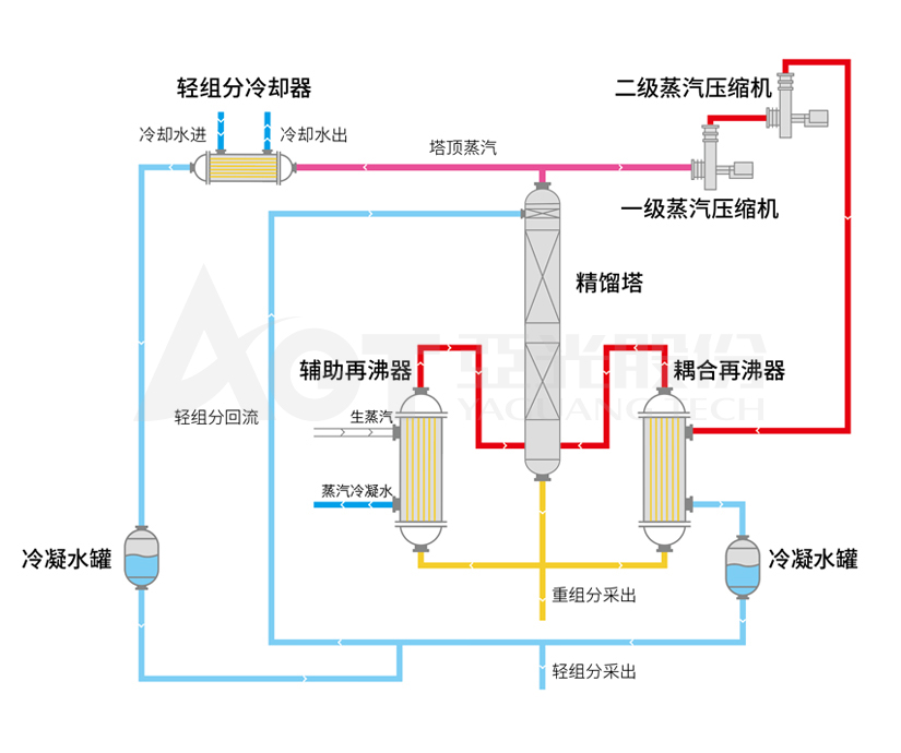 將出口處低溫位的氣體通過壓縮機壓縮,不需冷凝,提高氣體的溫度和壓力,增加氣體的焓值,然后作為再沸器的熱源給物料加熱,充分利用氣體的潛熱,減少生蒸汽的用量和循環水,降低運行成本。